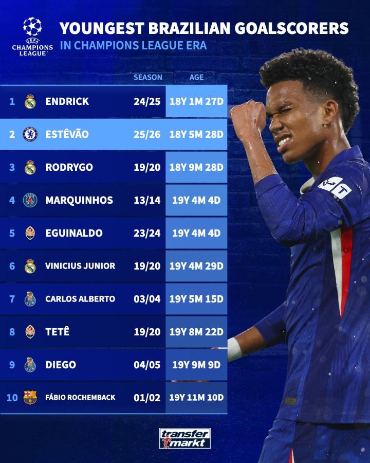 仅次于恩德里克,埃斯特旺是欧冠进球第二年轻的巴西球员